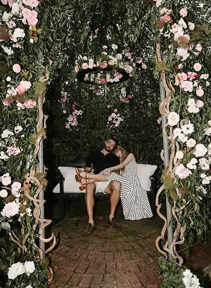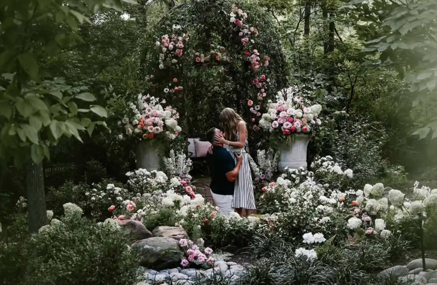 - The setting: A garden proposal under pink-and-white florals; photo set includes a knee-drop moment and post-proposal hugs.