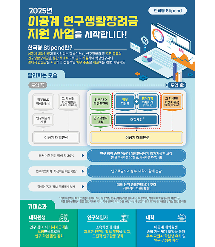 The Ministry of Science and ICT, together with the National Research Foundation of Korea, has announced the expansion of the STEM Research Stipend Program to include six additional universities. The program provides graduate students with a stable financial foundation so they can focus on their research without economic hardship. Beginning next month, the newly selected universities will start offering monthly stipends of 800,000 KRW for master’s students and 1.1 million KRW for doctoral students. With this expansion, a total of 35 universities and approximately 50,000 students will benefit in 2024.